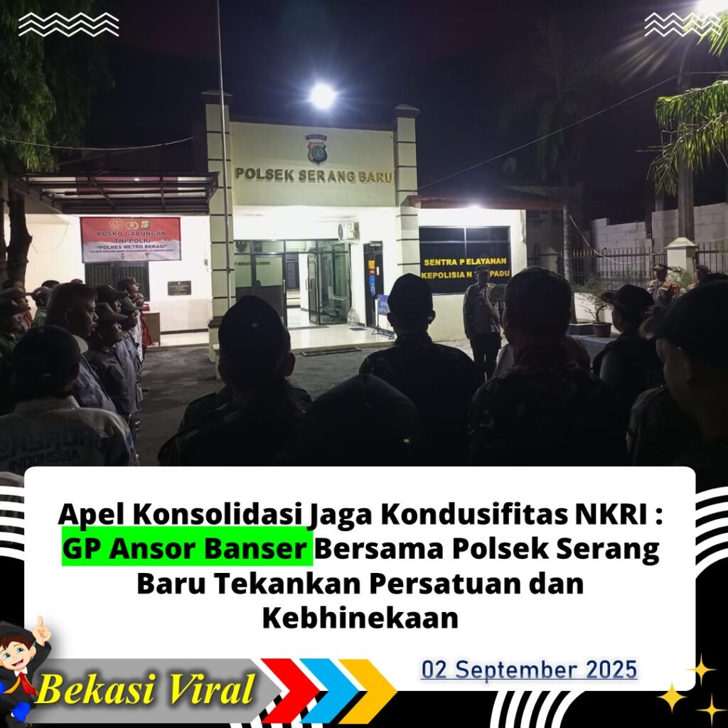 Bekasi — Dalam rangka menjaga kondusifitas wilayah dan memperkuat komitmen perdamaian NKRI, GP Ansor Banser bersama Polsek Serang Baru menggelar apel konsolidasi bersama pada Selasa 02 September 2025. Kegiatan ini berlangsung penuh khidmat dengan dihadiri berbagai unsur masyarakat dan organisasi.