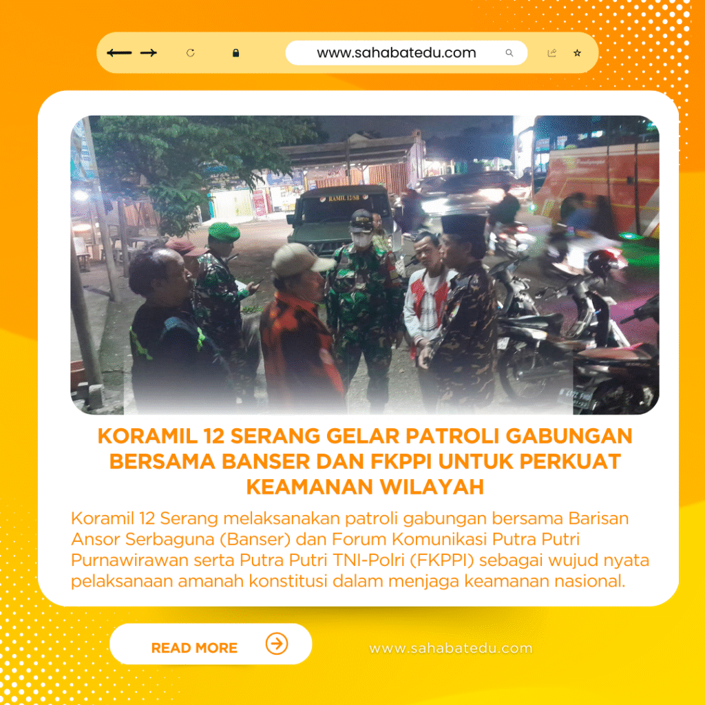 Koramil 12 Serang melaksanakan patroli gabungan bersama Barisan Ansor Serbaguna (Banser) dan Forum Komunikasi Putra Putri Purnawirawan serta Putra Putri TNI-Polri (FKPPI) sebagai wujud nyata pelaksanaan amanah konstitusi dalam menjaga keamanan nasional. Kegiatan ini merupakan implementasi dari tugas TNI sebagaimana tercantum dalam Pasal 30 ayat (3) UUD 1945, yang menyatakan bahwa Tentara Nasional Indonesia bertugas mempertahankan, melindungi, dan memelihara keutuhan dan kedaulatan negara.