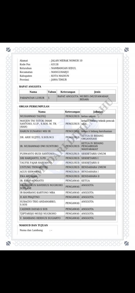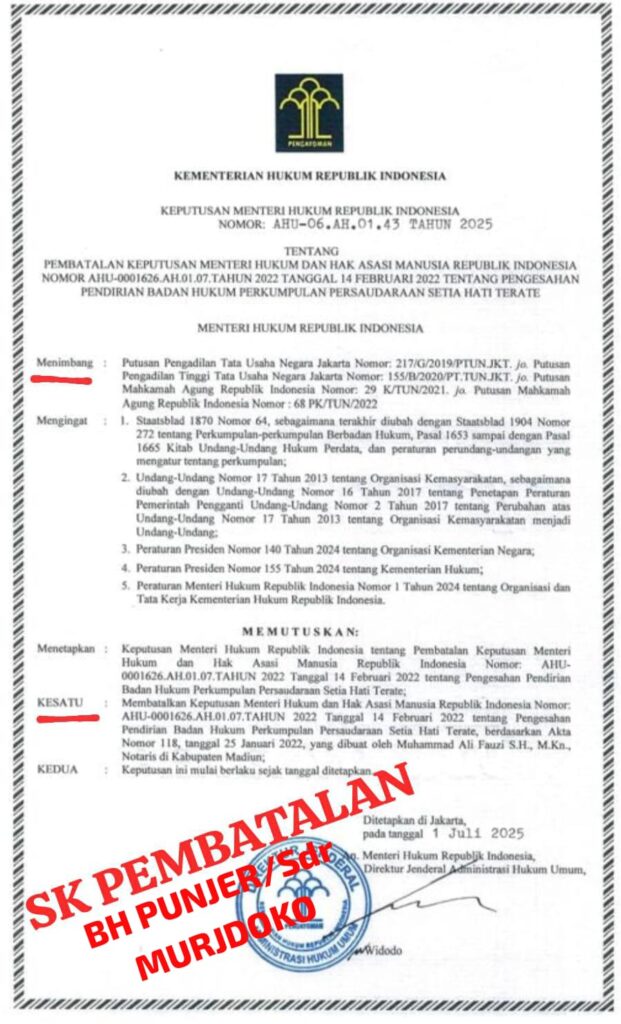 Jakarta, 21 Juli 2025 — Setelah melalui perjalanan panjang dan melelahkan di meja hijau, akhirnya titik terang perjuangan hukum organisasi Persaudaraan Setia Hati Terate (PSHT) resmi mencapai garis akhir. Pemerintah Republik Indonesia melalui Menteri Hukum resmi mengeluarkan Surat Keputusan Nomor: AHU-06.AH.01.43 TAHUN 2025, yang menegaskan dan mengembalikan status badan hukum PSHT kepada kepemimpinan Kang Mas Dr. Ir. Muhammad Taufiq, SH., MSc.