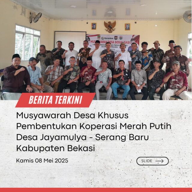 Pemerintah Desa Jayamulya melaksanakan Musyawarah Desa Khusus (Musdesus) dalam rangka Pembentukan Koperasi Merah Putih pada hari Kamis, 8 Mei 2025, bertempat di Balai Desa Jayamulya. Acara ini dipandu oleh Sekretaris Desa, Bapak Juhamad, selaku pembawa acara.