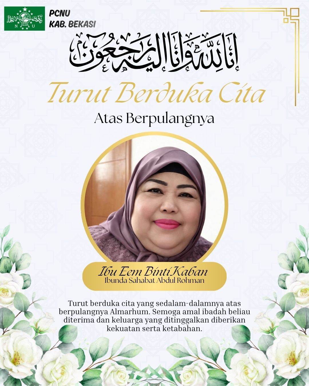 Keluarga besar Pengurus Cabang Nahdlatul Ulama (PCNU) Kabupaten Bekasi menyampaikan belasungkawa yang sedalam-dalamnya atas wafatnya almarhumah Ibu Eem binti Kaban, ibunda dari sahabat Abdurohman, yang saat ini menjabat sebagai Kasubag Dinas Koperasi Kabupaten Bekasi.