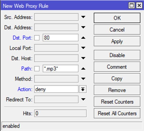 Untuk membuat transparent proxy di perlukan NAT untuk mengalihkan port 80 ke port 3128 masuk pada IP Firewall NAT add