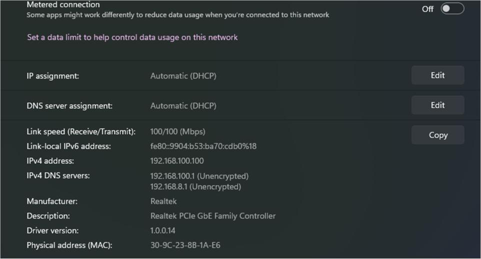 IP Address = 192.168.100.5 Subnet = 255.255.255.128 Gateway = 192.168.100.1 DNS = 8.8.8.8