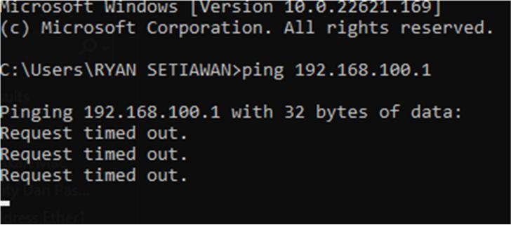 buka CMD / Command Promt Ketikan Perintah Ping 192.168.100.1 Pastikan keteranganya request time out