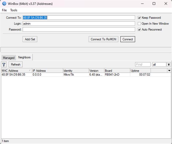 Lakukan sesuai dengan sekema pembagian port terlebih dahulu ( BAB III point B ) pastikan mikrotik terdeteksi pada winbox ( tab neighbor ) masuk menggunakan