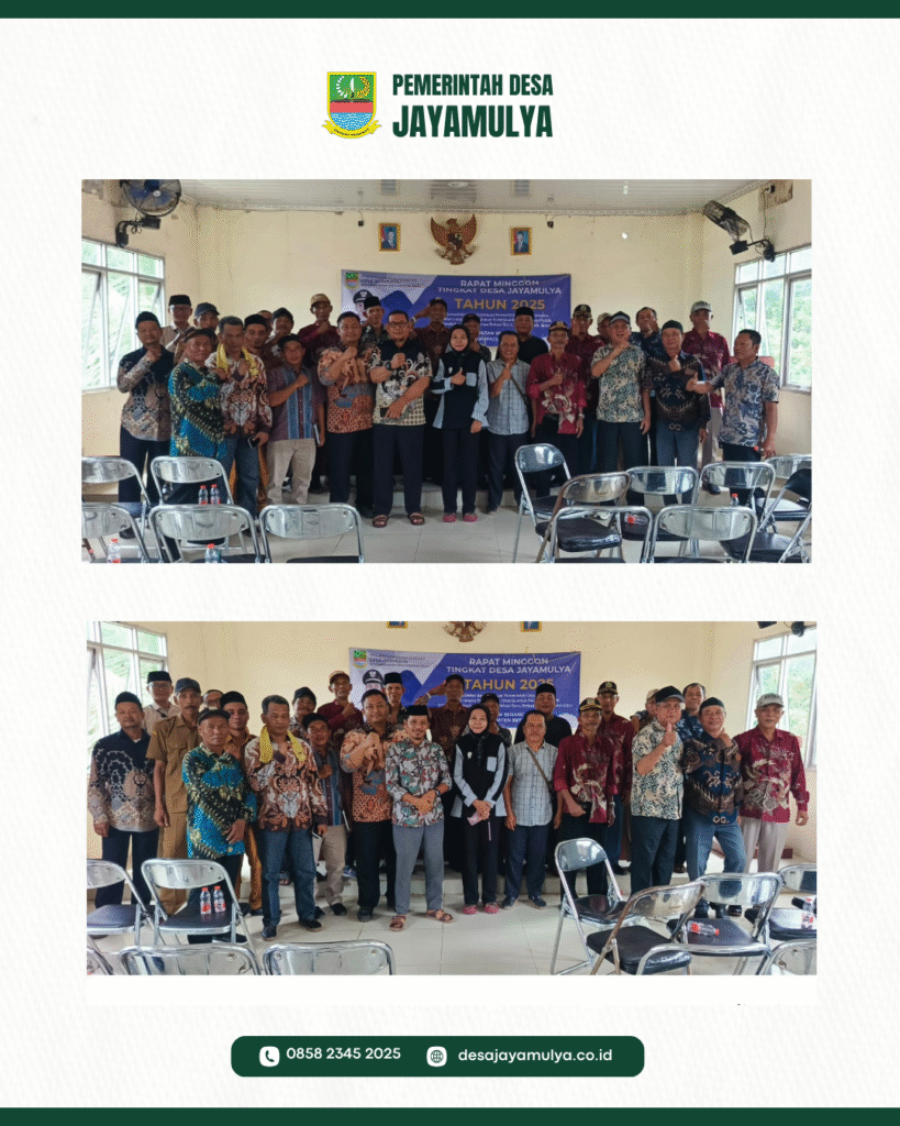 Dengan terselenggaranya rapat minggon yang informatif dan penuh kolaborasi ini, Pemdes Jayamulya menegaskan komitmennya untuk terus meningkatkan kualitas pelayanan, transparansi informasi, dan pemberdayaan masyarakat dalam pembangunan desa. Rapat ini diharapkan menjadi penguat sinergi antara perangkat desa, lembaga kemasyarakatan, dan masyarakat untuk mewujudkan Jayamulya yang semakin maju dan responsif terhadap kebutuhan warganya.