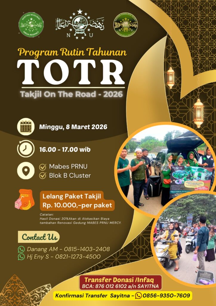 Mega Regency – Dalam rangka menghidupkan semangat berbagi di bulan suci Ramadan, Pengurus Ranting Nahdlatul Ulama (PRNU) Mega Regency bersama Muslimat NU kembali melaksanakan kegiatan rutin tahunan bertajuk “Takjil on The Road (ToTR) 2026.” Kegiatan bakti sosial ini dilaksanakan pada Minggu 8 Maret 2026, dengan membagikan ratusan paket takjil kepada masyarakat dan pengguna jalan menjelang waktu berbuka puasa.