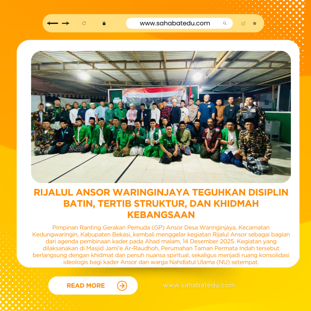 Pimpinan Ranting Gerakan Pemuda (GP) Ansor Desa Waringinjaya, Kecamatan Kedungwaringin, Kabupaten Bekasi, kembali menggelar kegiatan Rijalul Ansor sebagai bagian dari agenda pembinaan kader pada Ahad malam, 14 Desember 2025. Kegiatan yang dilaksanakan di Masjid Jami’e Ar-Raudhoh, Perumahan Taman Permata Indah tersebut berlangsung dengan khidmat dan penuh nuansa spiritual, sekaligus menjadi ruang konsolidasi ideologis bagi kader Ansor dan warga Nahdlatul Ulama (NU) setempat.
