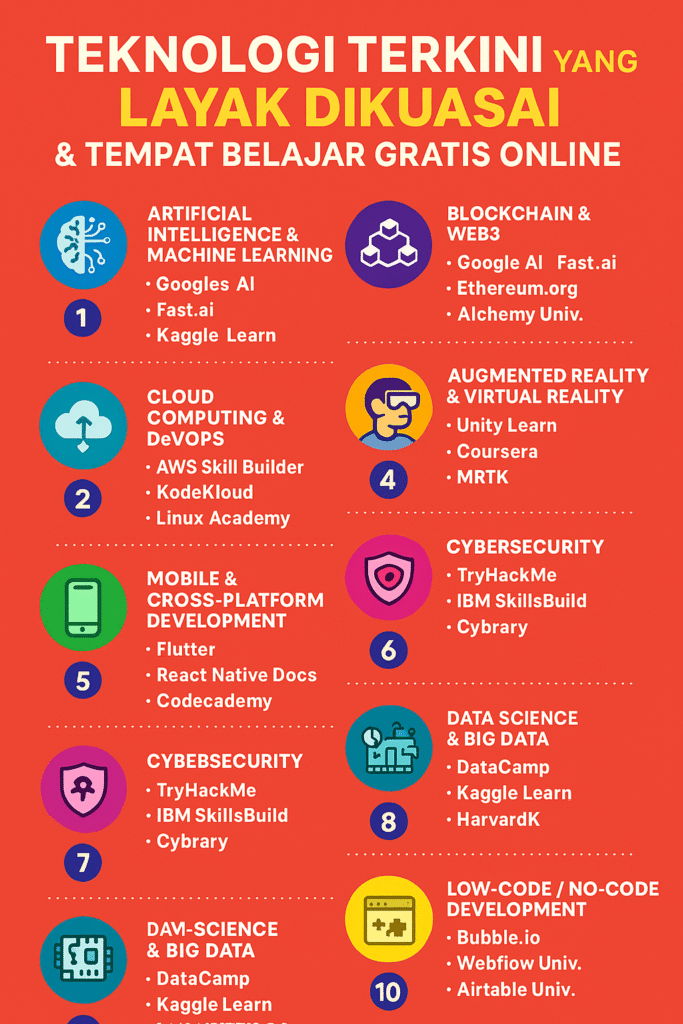 Di era digital yang berkembang pesat, menguasai teknologi terbaru bukan lagi pilihan, tapi kebutuhan. Berikut ini adalah daftar teknologi terkini yang sangat layak dipelajari, lengkap dengan penjelasan sederhana dan rekomendasi tempat belajar gratis secara online.