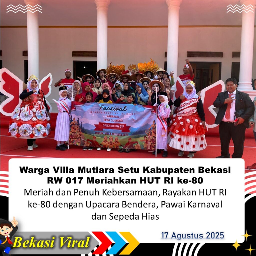 BEKASI — Semangat kemerdekaan Republik Indonesia ke-80 begitu terasa di Perumahan Villa Mutiara Setu RW 017, Minggu (17/8/2025). Warga bersama unsur Muspika Kecamatan Setu menggelar upacara bendera di Stadion Mini Cijengkol, sekaligus ambil bagian dalam karnaval tingkat kecamatan untuk mendukung Desa Cijengkol.